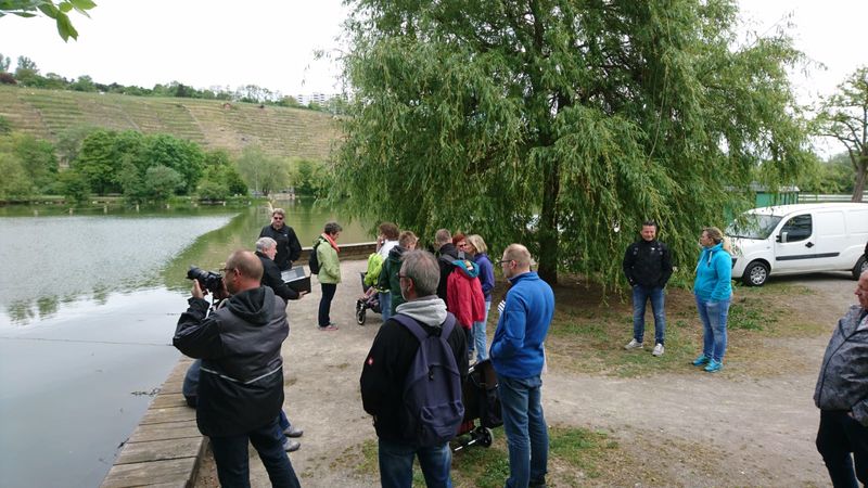 Bei schönstem Wanderwetter kamen viele Mitglieder und ihre Familien um der neusten Wanderstrecke von Hermann zu folgen. Dieser hatte die Vier-Burgen-Tour von Mühlhausen im Gepäck und so startete die 30 Personen große Gruppe am Max-Eyth-See und nahm Kurs auf den Max-Eyth-Steg.